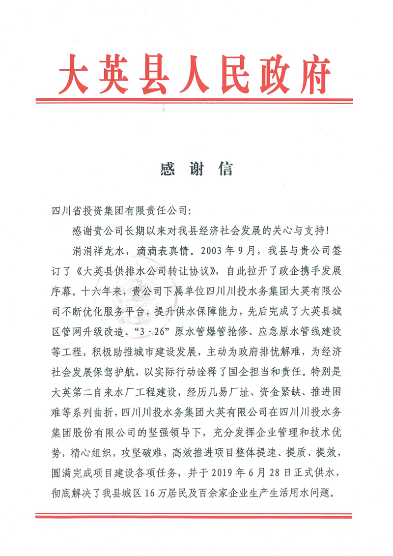 會(huì)見(jiàn)期間,文副縣長(zhǎng)親手將感謝信送到了梁董事長(zhǎng)手中并合影留念。大英縣機(jī)關(guān)事務(wù)保障中心副主任蔣長(zhǎng)壽,川投水務(wù)黨委委員、紀(jì)委書記但必良,總經(jīng)理助理、大英水司總經(jīng)理劉松果參加了會(huì)見(jiàn)。