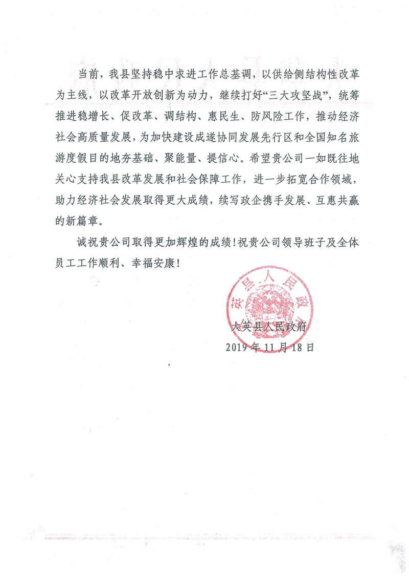 川投水務(wù)黨委書記、董事長(zhǎng)梁有國(guó)對(duì)文副縣長(zhǎng)一行的到訪表示熱烈歡迎,向大英縣委、縣政府對(duì)長(zhǎng)期以來(lái)對(duì)川投水務(wù)工作的支持表示感謝。他表示,川投水務(wù)將繼續(xù)努力提升服務(wù)水平與質(zhì)量,做到讓政府放心,讓群眾滿意,并愿意與大英縣政府不斷深化合作、攜手共進(jìn),為大英社會(huì)經(jīng)濟(jì)發(fā)展和民生事業(yè)改善貢獻(xiàn)更大力量。