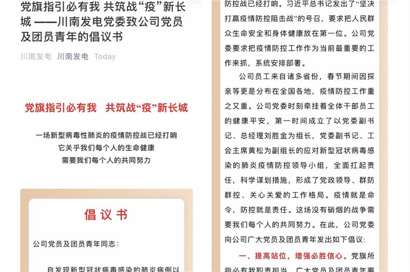 2020年1月31日,川南發(fā)電公司黨委通過(guò)公司微信公眾平臺(tái)正式發(fā)布《黨旗指引必有我 共筑戰(zhàn)“疫”新長(zhǎng)城——川南發(fā)電黨委致公司黨員及團(tuán)員青年的倡議書(shū)》。在新型冠狀病毒感染的肺炎疫情肆虐的背景下,一場(chǎng)關(guān)系到每一位公民生命健康的疫情防控戰(zhàn)已經(jīng)打響。川南發(fā)電黨委向公司廣大黨員及團(tuán)員青年發(fā)出倡議,號(hào)召大家一是提高站位,增強(qiáng)必勝信心;二是強(qiáng)化防范,做好科學(xué)預(yù)防;三是勇于擔(dān)當(dāng),發(fā)揮先鋒作用。