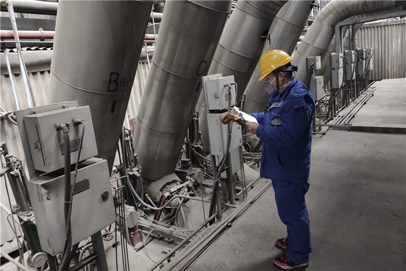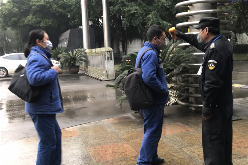 在廠門口,為進(jìn)出的每一位員工測量體溫,監(jiān)督檢查口罩的佩戴情況。