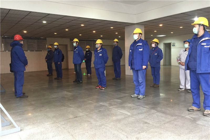 在班前會上,同事們佩戴口罩間隔一米以上聽取值長進(jìn)行工作安排。