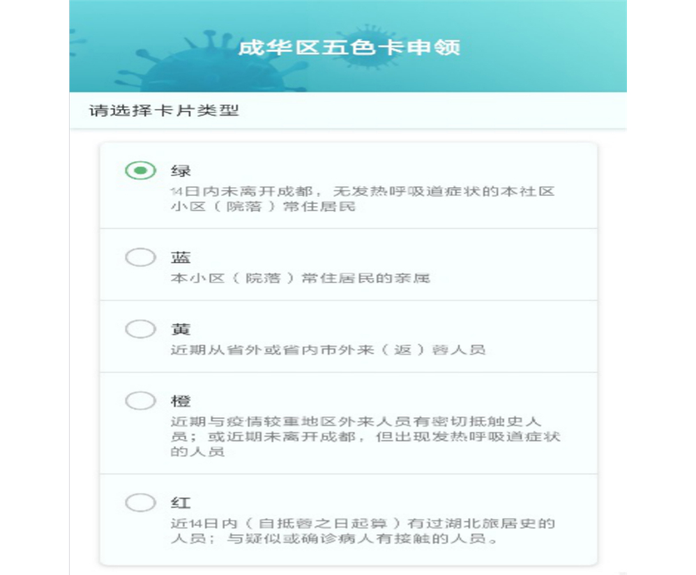 據(jù)介紹,“五色卡”管理系統(tǒng)根據(jù)色卡顏色不同,對未離蓉、外地返蓉、具備發(fā)熱呼吸道癥狀、有過湖北旅居史、與疑似或確診病人有接觸、臨時進入小區(qū)院落等各類人群進行區(qū)分,具備信息線上填報、統(tǒng)計、查詢及工作人員驗證等多種功能,從而實現(xiàn)對高風(fēng)險人群信息及健康狀況及時掌握、上報,并有效管控潛在傳染源。為避免線下領(lǐng)卡點人群聚集,系統(tǒng)同時提供了移動端。小區(qū)住戶可通過掃描五色卡二維碼進入小程序,錄入姓名、身份證后四位并上傳照片后領(lǐng)取電子五色卡。