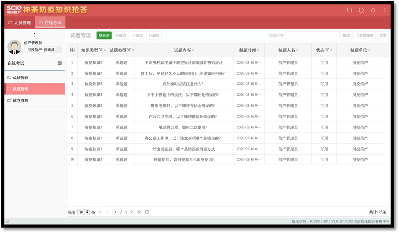 “抗擊新冠肺炎疫情,除了黨和政府的決心努力,每位公民的作用也不可忽視?!必?fù)責(zé)研發(fā)該系統(tǒng)的智勝集成公司相關(guān)負(fù)責(zé)人說,為貫徹川投集團(tuán)黨委和川投信產(chǎn)關(guān)于發(fā)揮企業(yè)優(yōu)勢全力抗擊疫情的指示,公司組織精兵強(qiáng)將加班加點開發(fā)了此系統(tǒng),希望通過參與答題,讓普通民眾更進(jìn)一步了解新冠肺炎的傳播途徑和相關(guān)防護(hù)措施,保持良好個人生活習(xí)慣和公共衛(wèi)生習(xí)慣,助力國家打贏疫情防控阻擊戰(zhàn)。