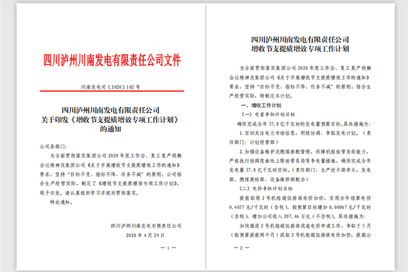 為全面貫徹落實(shí)集團(tuán)公司2020年度工作會(huì)、復(fù)工復(fù)產(chǎn)視頻會(huì)議精神及集團(tuán)公司《關(guān)于開展增收節(jié)支提質(zhì)增效工作的通知》要求,4月29日,川南發(fā)電印發(fā)實(shí)施了《增收節(jié)支提質(zhì)增效專項(xiàng)工作計(jì)劃》,對(duì)公司增收節(jié)支提質(zhì)增效重點(diǎn)工作進(jìn)行了安排部署。