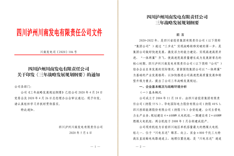 為加快推進轉(zhuǎn)型升級,促進公司高質(zhì)量發(fā)展,川南發(fā)電緊緊圍繞集團公司“一體兩翼”產(chǎn)業(yè)布局,結(jié)合自身發(fā)展實際,研究制定了《三年戰(zhàn)略發(fā)展規(guī)劃綱要》,提出了公司未來三年戰(zhàn)略發(fā)展計劃。