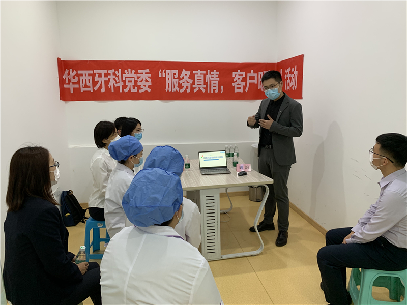 “國際護士節(jié)”來臨,5月12日上午,華西牙科組織開展“服務(wù)真情,客戶暖心”系列活動,業(yè)務(wù)團隊在華西牙科所屬企業(yè)華西天健合作的成都市郫都區(qū)普樂米診所,會同運營人員及醫(yī)護人員現(xiàn)場講授感控知識,培訓口內(nèi)掃描儀等設(shè)備的實際操作,講解疫情下獲客注意事項。華西牙科黨委委員劉佳、華西天健教育培訓副總監(jiān)劉韻、華西牙科黨員代表、醫(yī)生、護士代表參加了此次活動。本次活動是華西牙科臨時黨委開展貫徹《條例》試點工作系列活動之一,活動旨在發(fā)揮華西牙科品牌的服務(wù)優(yōu)勢,促進業(yè)務(wù)與黨建的深度融合。