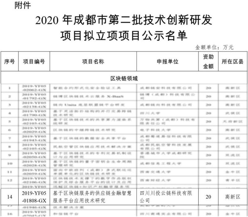 5月8日,川投信產(chǎn)所屬川投云鏈公司申報(bào)的“基于區(qū)塊鏈服務(wù)的供應(yīng)鏈金融智慧服務(wù)平臺(tái)應(yīng)用技術(shù)研究項(xiàng)目”,順利通過(guò)成都市科技局技術(shù)創(chuàng)新研發(fā)項(xiàng)目公示。作為成都市2020年第二批21項(xiàng)重點(diǎn)研發(fā)項(xiàng)目,將獲得20萬(wàn)元的專項(xiàng)資金支持。