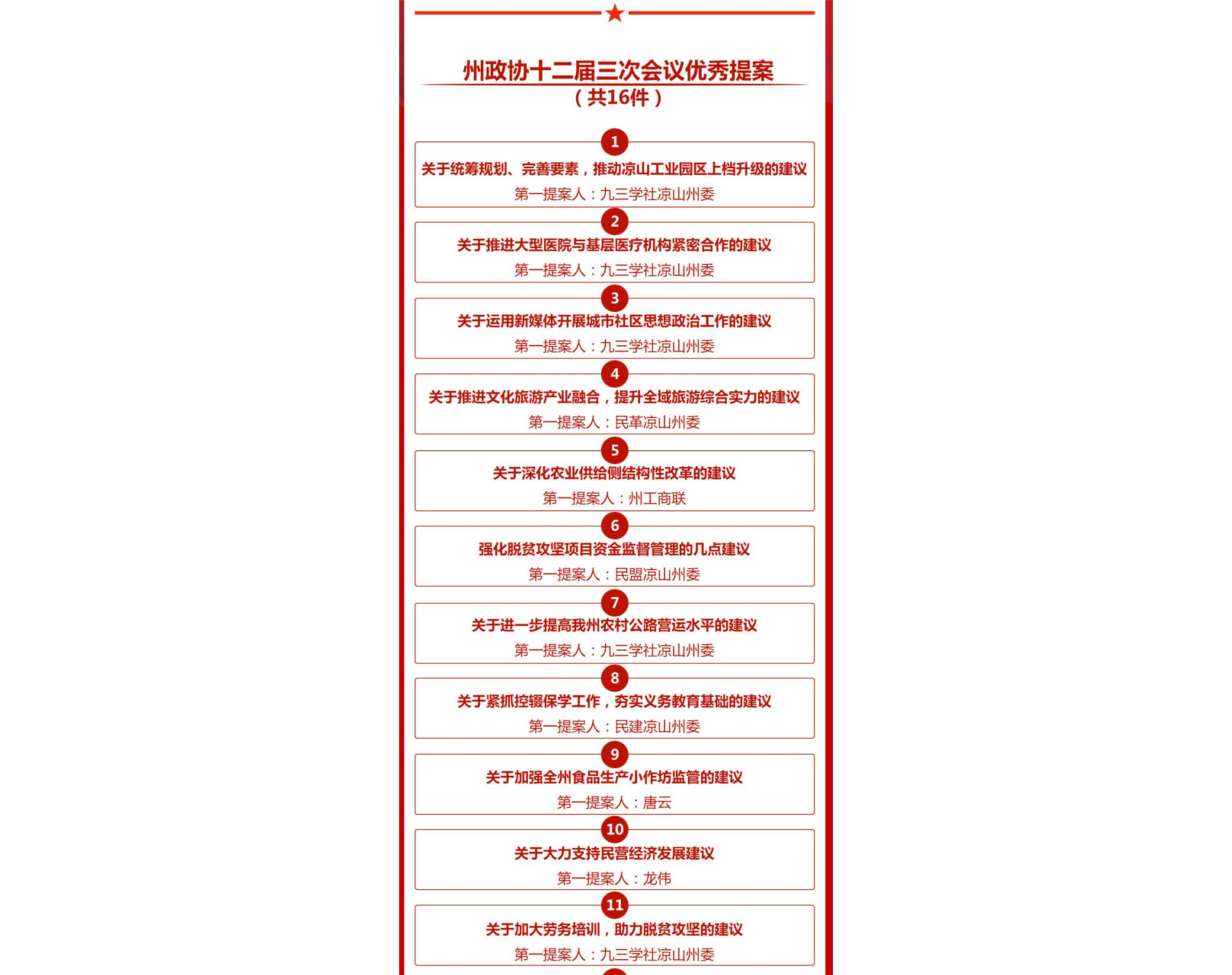 為表揚先進(jìn)、凝聚力量、推動工作,6月9日下午,涼山州政協(xié)十二屆四次會議第二次全體會宣讀了《關(guān)于表彰州政協(xié)十二屆三次會議優(yōu)秀提案、提案承辦先進(jìn)單位和提案工作先進(jìn)單位及個人的決定》(涼政協(xié)委發(fā)〔2020〕1號),對州政協(xié)十二屆三次會議的16件優(yōu)秀提案、12個提案承辦先進(jìn)單位、10個提案工作先進(jìn)單位及12名提案工作先進(jìn)個人予以表揚。