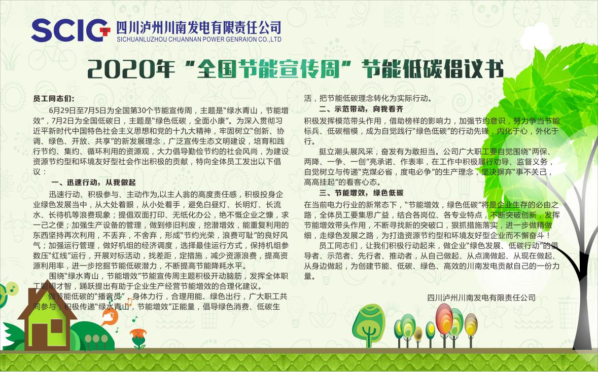 節(jié)約能源、提高能源利用率,既是保障企業(yè)正常生產經營,實現(xiàn)公司健康可持續(xù)發(fā)展的長久之計,也是企業(yè)適應市場需要,降低成本、增加效益、改善環(huán)境,提高企業(yè)競爭力的必然選擇。為深入貫徹習近平新時代中國特色社會主義思想和黨的十九大精神,牢固樹立“創(chuàng)新、協(xié)調、綠色、開放、共享”的新發(fā)展理念,川南發(fā)電公司認真落實《關于開展2020年全國節(jié)能宣傳周和全國低碳日活動的通知》(發(fā)改環(huán)資〔2020〕920號)要求,研究制定了《2020年節(jié)能宣傳周和低碳日活動實施方案》,通過多種形式,開展了節(jié)能低碳的宣傳和教育活動。一是在生產例會上,公司領導部署了節(jié)能低碳的具體工作,要求公司各部門組織員工認真學習國家有關節(jié)能的法規(guī)、政策,做好貫徹;號召全體職工爭做企業(yè)“綠色發(fā)展、低碳行動”的倡導者、示范者、先行者、推動者,從自己做起、從點滴做起、從現(xiàn)在做起、從身邊做起,為創(chuàng)建節(jié)能、低碳、綠色、高效的川南發(fā)電貢獻自己的一份力量。二是公司節(jié)能辦公室向全體員工及外委單位發(fā)出了《2020年“全國節(jié)能宣傳周”節(jié)能低碳倡議書》,利用公司內網平臺、微信公眾號、宣傳欄等進行節(jié)能法規(guī)、知識的宣傳;對公司生產現(xiàn)場和辦公場所節(jié)能工作進行了檢查,要求各部門加強對職工節(jié)能意識的教育,認真落實公司制度,切實把節(jié)能工作落到實處。三是生產技術部、發(fā)電部、設備維修部等部門結合自身實際開展了節(jié)能、低碳大討論活動。