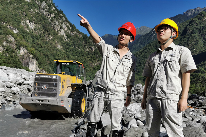 8月24日天剛亮,水工部專業(yè)人員在對作業(yè)工人進(jìn)行了安全技術(shù)交底;確認(rèn)周圍環(huán)境沒有安全隱患后,通知道路維護(hù)單位大型工程機(jī)械進(jìn)場,電站現(xiàn)場主干道公路路面泥石流清淤開挖啟動(dòng)。由于搶險(xiǎn)現(xiàn)場仍然有降雨,一方面搶險(xiǎn)工作緊張有序開展;另一方面水工部專人持續(xù)監(jiān)視龔家溝河道來水,預(yù)防河水忽然上漲或者中斷,確保作業(yè)人員人身安全。