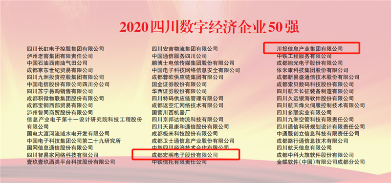 1月7日,2020四川企業(yè)100強發(fā)布會在成都舉行,川投信產(chǎn)成功入選2020年“四川數(shù)字經(jīng)濟企業(yè)50強”“四川服務(wù)業(yè)企業(yè)100強”及“四川數(shù)字經(jīng)濟成長型企業(yè)”3項榜單。川投信產(chǎn)所屬宏明電子榮獲“2020四川制造業(yè)企業(yè)100強”和“2020四川數(shù)字經(jīng)濟企業(yè)50強”。