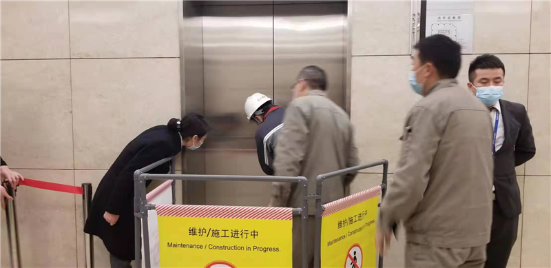 演練中,客戶代表進入電梯并從1樓上行至3樓時,電梯突然停運,乘梯人員在橋箱內(nèi)報警呼救,監(jiān)控值班人員立即報告現(xiàn)場演練指揮,演練指揮立即啟動應(yīng)急預(yù)案,并向服務(wù)中心各部門發(fā)布應(yīng)急救援指令。監(jiān)控值班室通過五方通話詢被困人員情況,進行心理安撫和情緒疏導(dǎo)溝通;工程部迅速聯(lián)系維保單位到現(xiàn)場施救;秩序維護部和客服部迅速到達現(xiàn)場,設(shè)置警戒,詢問被困人員情況,心理安撫和情緒疏導(dǎo)溝通。與此同時,電梯維保人員5分鐘內(nèi)趕到現(xiàn)場,迅速拉起黃色警戒線,建立作業(yè)區(qū)域圍擋,確認轎廂位置,開展?fàn)I救作業(yè)?,F(xiàn)場的工作人員打開電梯門,被困人員離開電梯,客服安慰其情緒,詢問被困人員身體狀況,以便后續(xù)跟進。